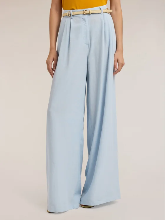 Pantaloni palazzo con pieghe in tela di lino misto lyocell; apertura frontale con bottone e zip nascosta; tasche all'americana inserite nel fianco