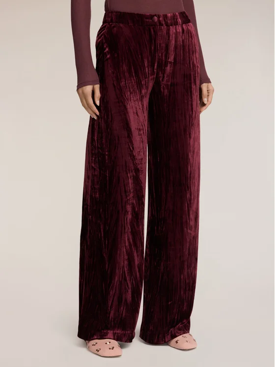 Pantaloni palazzo in velluto effetto plissé; vestibilità regular, chiusura con bottoni e zip; tasche all'americana inserite nel fianco.