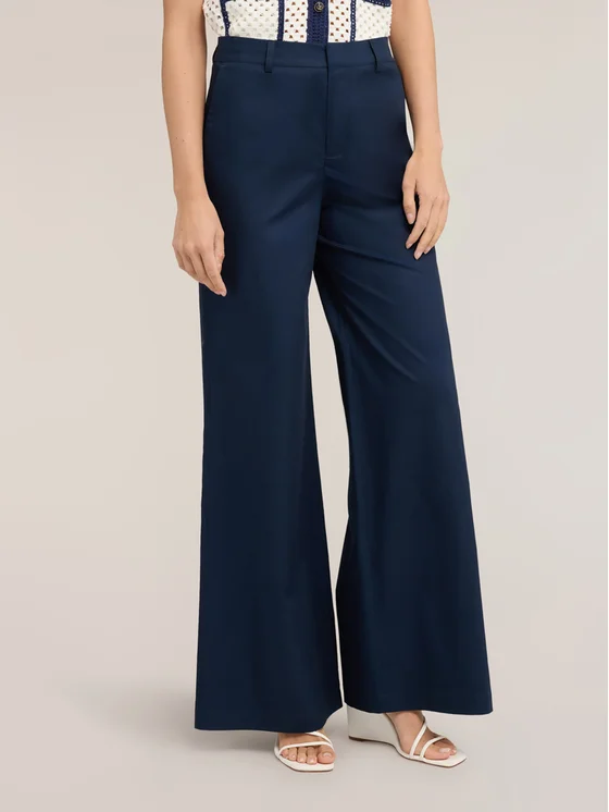 Pantaloni palazzo in raso di cotone; vestibilità wide, chiusura frontale con gancetto e zip; tasche all'americana inserite nei fianchi.