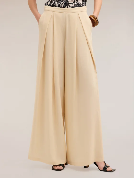 Pantaloni palazzo in tessuto fluido di viscosa misto lino; pieghe a soffietto nella parte superiore; chiusura con zip laterale