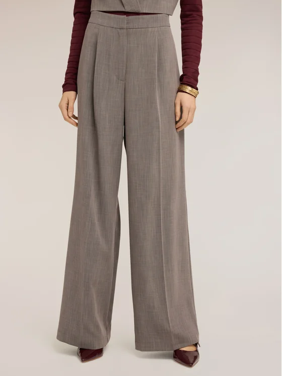 Pantaloni palazzo in tessuto tinto filo di poliviscosa; chiusura frontale sartoriale; tasche laterali inserite nei fianchi, piega stirata nel centro gamba; MADE IN ITALY.