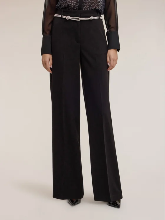 Pantaloni palazzo in poliviscosa; chiusura frontale sartoriale ed elastico inserito nella parte posteriore; tasche all'americana, piega stirata nel centro gamba.