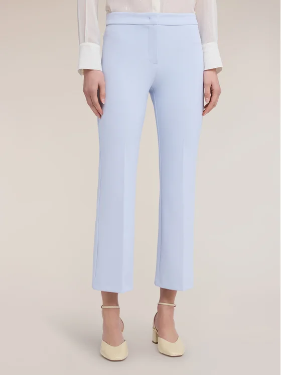 Pantaloni cropped in tessuto crêpe di poliviscosa; chiusura frontale sartoriale; tasche posteriori a filetto, piega stirata nel centro gamba.