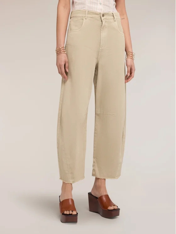 Pantaloni barrel in drill di cotone tinto in capo; apertura frontale con bottone e zip; tasche verticali inserite nei fianchi, orlo con taglio vivo; MADE IN ITALY.