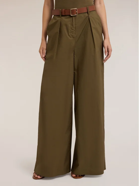Pantaloni palazzo in popeline di cotone; apertura frontale con bottone e zip; pieghe nella parte superiore