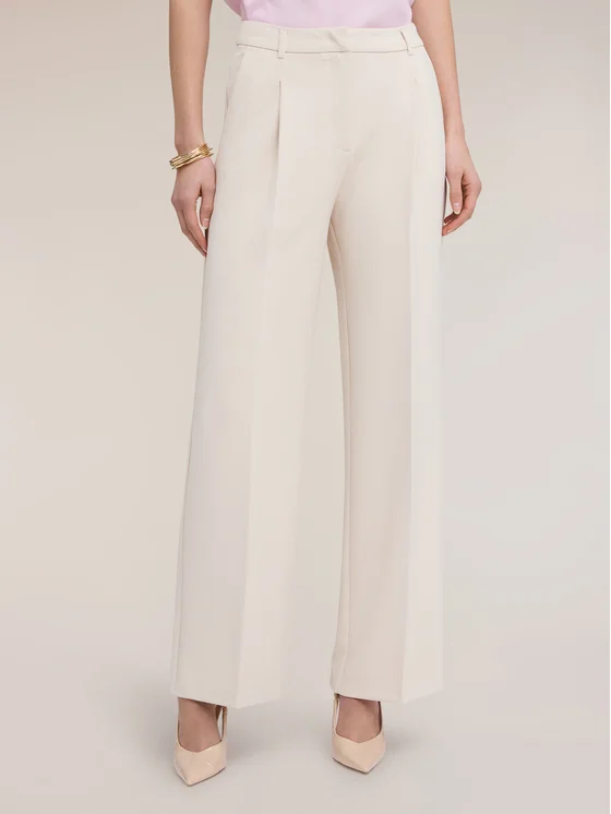 Pantaloni palazzo in cady crêpe; chiusura frontale sartoriale; tasche laterali inserite nei fianchi, piega stirata nel centro gamba.