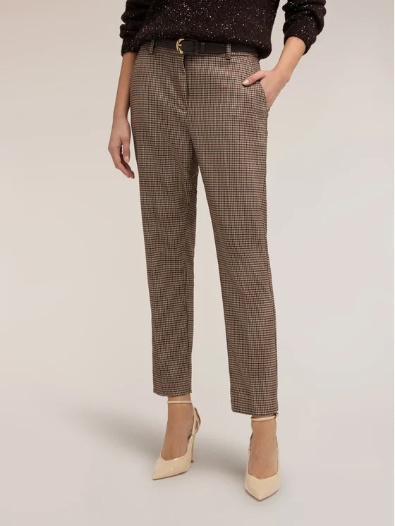 Pantaloni regular in poliviscosa tinto filo fantasia check; apertura frontale sartoriale con gancetto e zip; tasche all'americana inserite nel fianco, piega stirata nel centro gamba