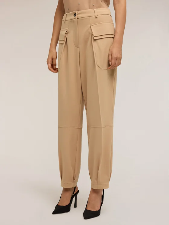 Pantaloni cargo in tessuto fluido misto viscosa; apertura frontale con bottone e zip; tasche laterali con patta, fondo gamba con motivo pinces