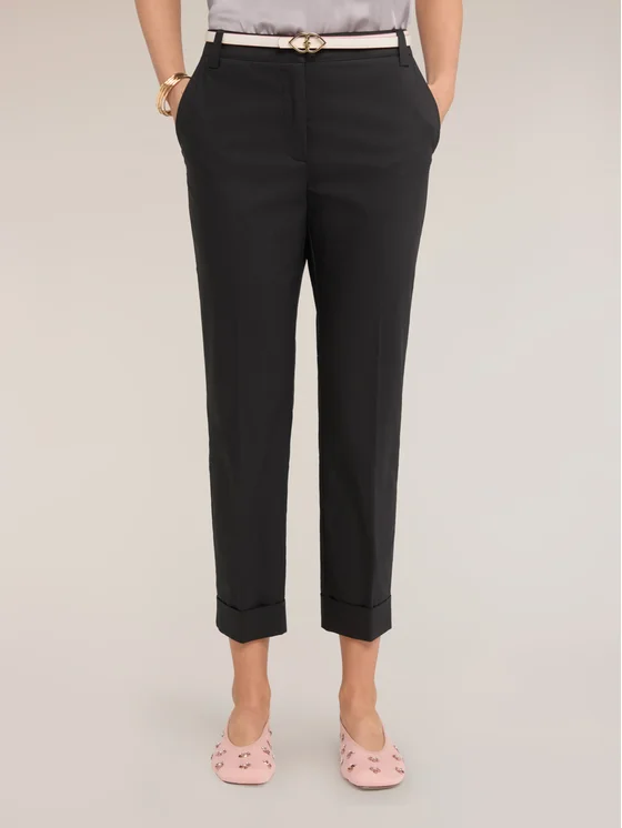 Pantaloni cropped in cotone tecnico; vestibilità chino, chiusura frontale con gancetto e zip; tasche laterali inserite nei fianchi, piega stirata nel centro gamba, fondo con risvolto.