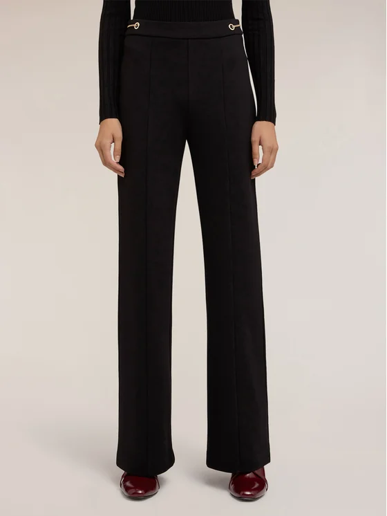 Pantaloni flare in punto milano; chiusura nel centro dietro con zip, cintura con dettaglio laterale di occhielli metallici e catenella; tagli shaping verticali nel centro gamba
