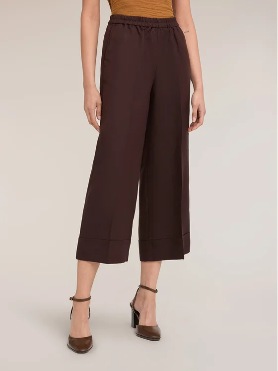 Pantalone cropped in tela di misto lino lyocell; chiusura con fascia elastica in vita; tasche laterali inserite nei fianchi, risvolto sul fondo.