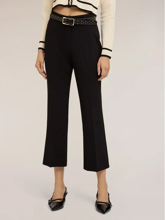 Pantaloni kick flare in poliviscosa crêpe; apertura frontale con gancetto interno e zip; piega stirata nel centro gamba