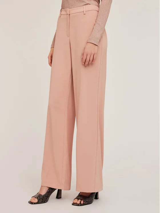 Pantaloni palazzo in envers satin tinta unita; apertura frontale con abbottonatura sartoriale; tasche all'americana inserite nel fianco