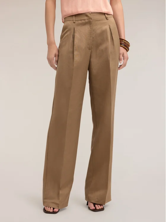 Pantaloni palazzo con pieghe in lino viscosa; apertura frontale con gancetto e zip nascoste; tasche all'americana inserite nel fianco