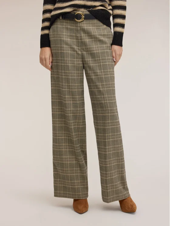 Pantalone in tessuto tinto filo di poliviscosa con fantasia check; vestibilità wide con chiusura sartoriale; tasche laterali inserite nei fianchi.
