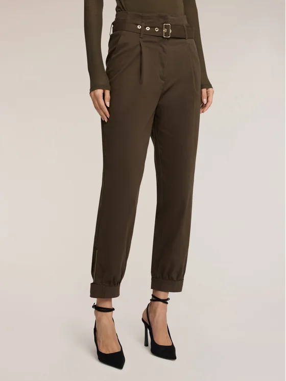 Pantaloni in tessuto armaturato misto cotone; vestibilità chinos con vita a sacchetto, cintura in vita tono su tono; tasche laterali, zip decorativa sul fondo gamba con bottone.
