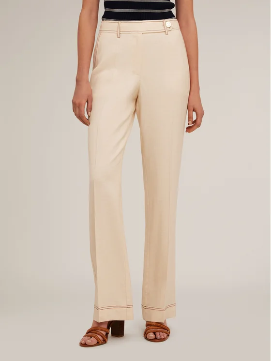 Pantaloni fluidi in tela mista viscosa lino con impunture in contrasto colore; apertura frontale a bottone e zip, tasche all'americana inserite nel fianco; piega stirata nel centro gamba