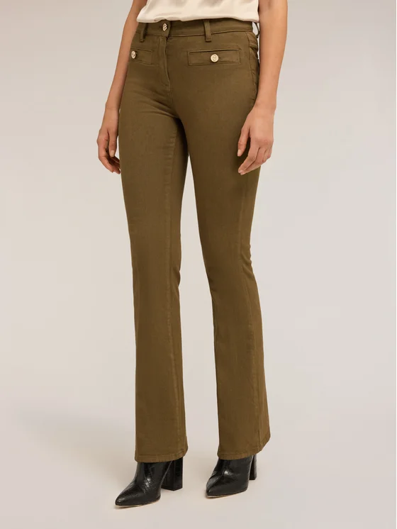 Pantaloni flare in drill di cotone stretch tinto in capo; abbottonatura con bottone metallico e zip nascosta; motivo tasche a filetto, gamba aderente e svasata al fondo