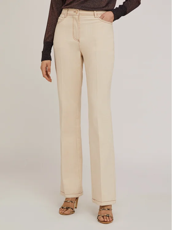 Pantaloni flare in drill misto cotone stretch con impunture in contrasto colore; modello a cinque tasche con apertura frontale a bottone e zip; piega stirata nel centro gamba