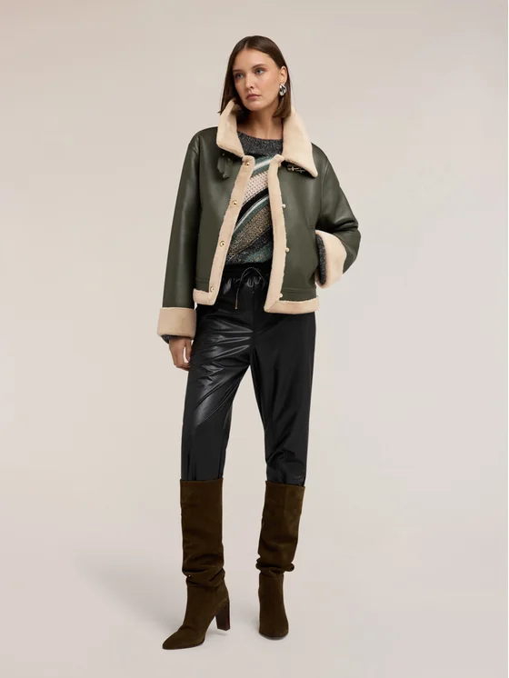 Giubbotto in tessuto effetto shearling; vestibilità regular con chiusura frontale a bottoni automatici; colletto, polsini e bordo inferiore in tessuto morbido, tasche laterali con patta e bottone.