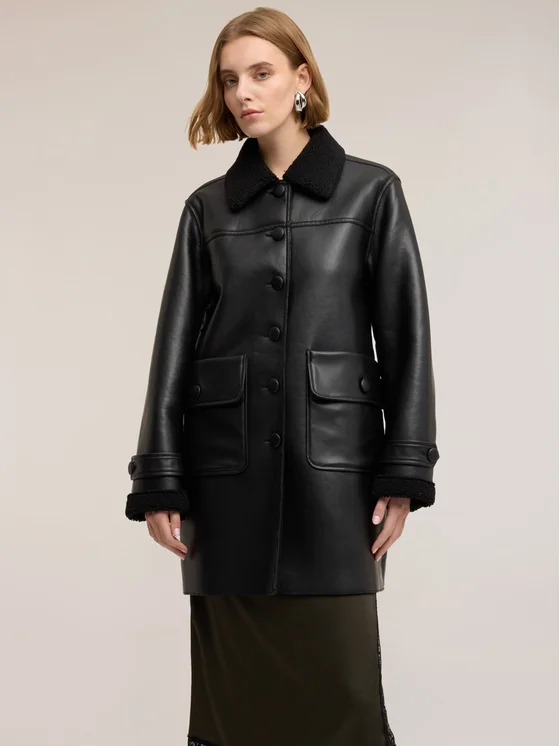 Cappotto in tessuto effetto spalmato; vestibilità regular con chiusura a bottoni frontale; collo e polsini rifiniti, due tasche frontali con patta.