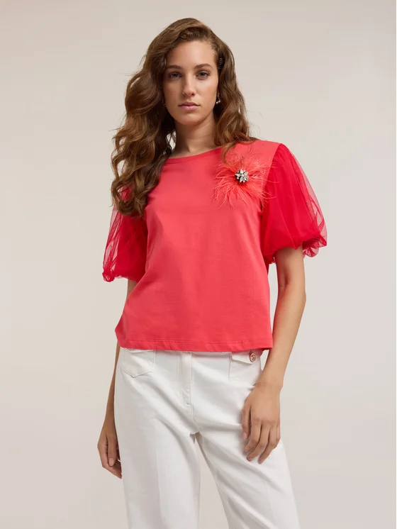 T-shirt in jersey con spilla gioiello e piume; scollatura tonda frontale; maniche a palloncino doppiate in tulle tono su tono