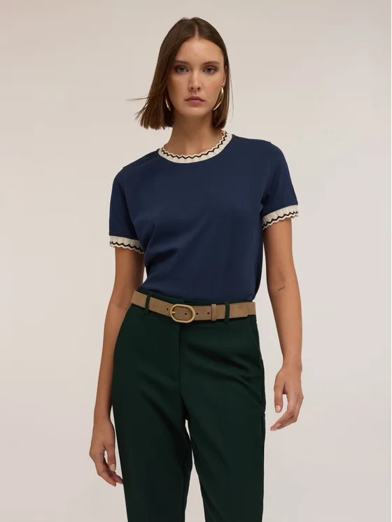 T-shirt in jersey di cotone tinta unita; bordi in maglia lavorata e riga lurex; modello con scollatura tonda e maniche corte