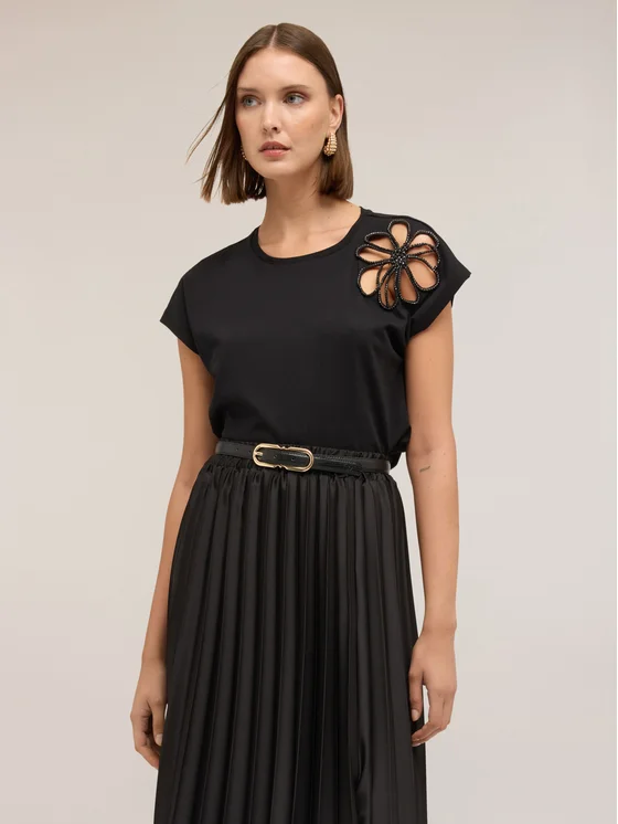 T-shirt in jersey di cotone; vestibilità regular con cut-out ricamato floreale; scollatura girocollo e maniche corte a kimono