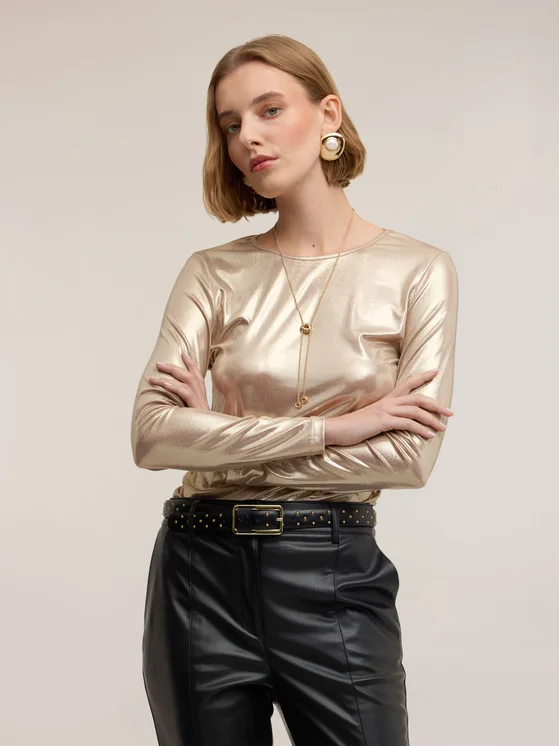 T-shirt in jersey con lavorazione laminata; vestibilità fitted con scollatura girocollo; maniche lunghe.