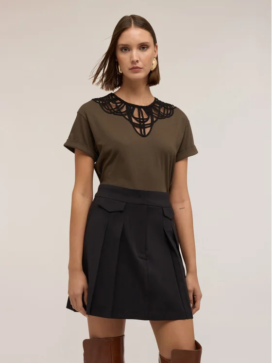 T-shirt in jersey di cotone misto modal; scollatura tonda con ricamo in tessuto e motivo a goccia posteriore; maniche corte con risvolto sul fondo