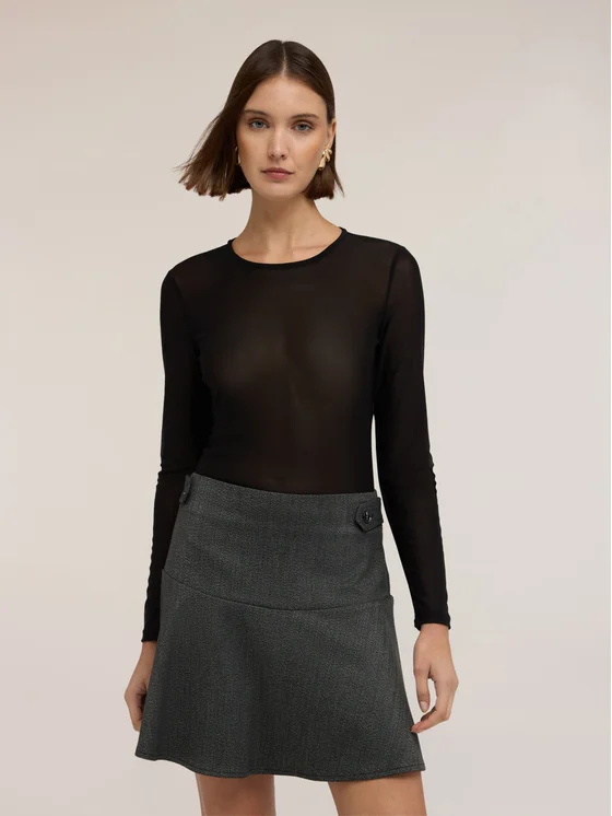 T-shirt a body in tulle; vestibilità fitted con chiusura zip; scollatura girocollo e maniche lunghe; MADE IN ITALY.