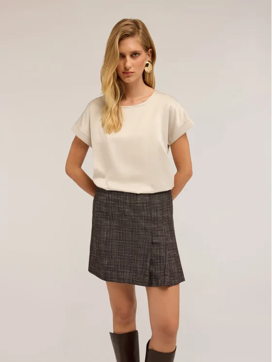 T-shirt con scollo a barchetta, maniche corte a kimono; parte davanti in fluido raso; retro in jersey di viscosa