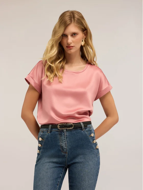 T-shirt con scollo a barchetta, maniche corte a kimono; parte davanti in fluido raso; retro in jersey di viscosa