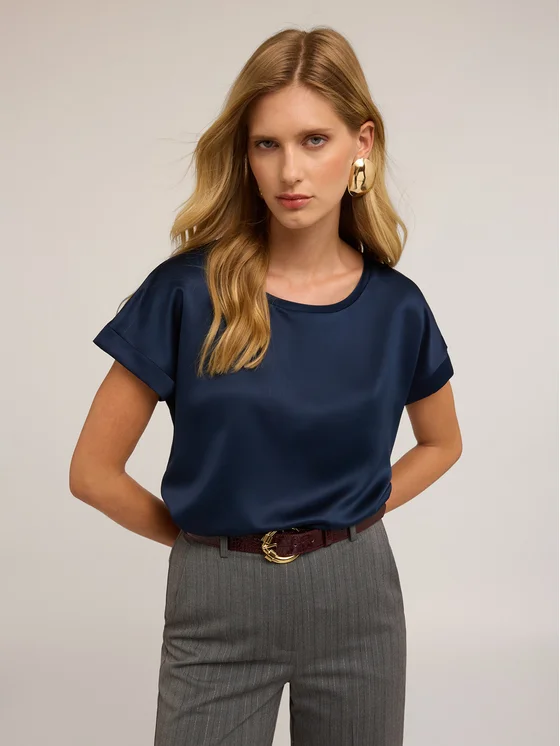 T-shirt con scollo a barchetta, maniche corte a kimono; parte davanti in fluido raso; retro in jersey di viscosa