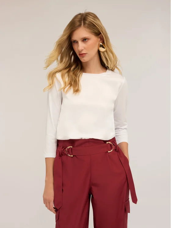 T-shirt basic bimaterica; scollo a barca con bordo in maglia a coste; maniche lunghezza tre quarti, piccolo spacco laterale