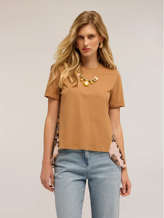 T-shirt in jersey di cotone; scollatura arrotondata; inserto posteriore in tessuto stampato a fiori e con arricciature