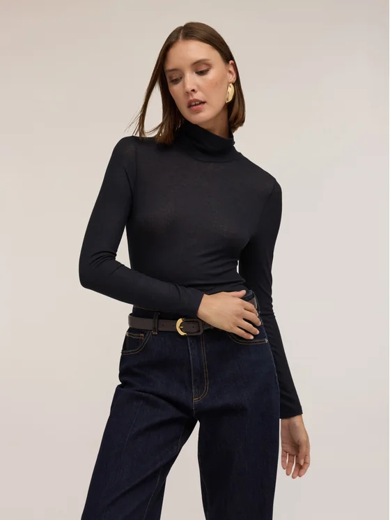 Body in jersey a coste misto cachemire; scollatura a dolcevita; maniche lunghe, slip con chiusura ad automatici