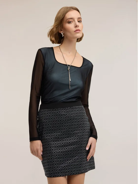 Maglia in tulle e jersey in contrato colore; scollatura ampia quadrata; maniche lunghe, leggero arriccio sul fianco.