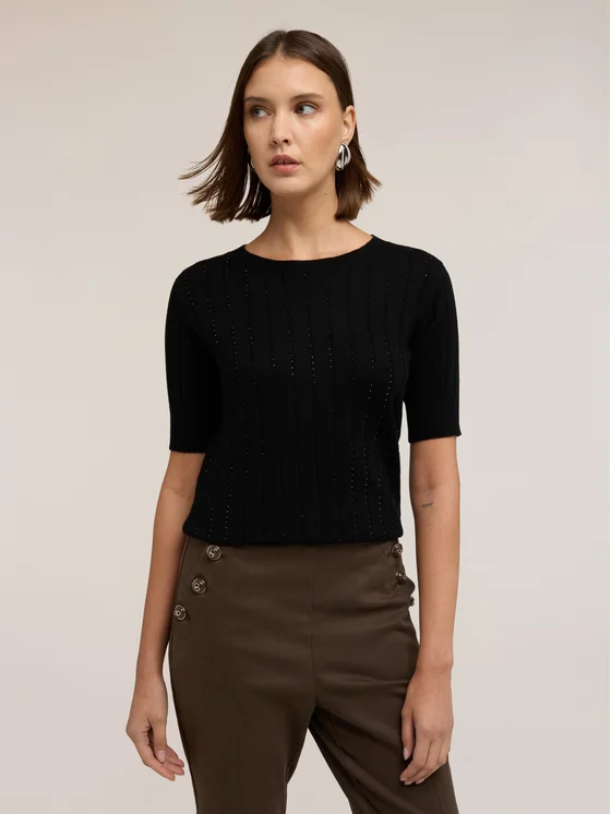 Maglia in filato misto lana con applicazione di strass tono su tono; vestibilità fitted con scollatura girocollo; maniche corte, lavorazione a coste.