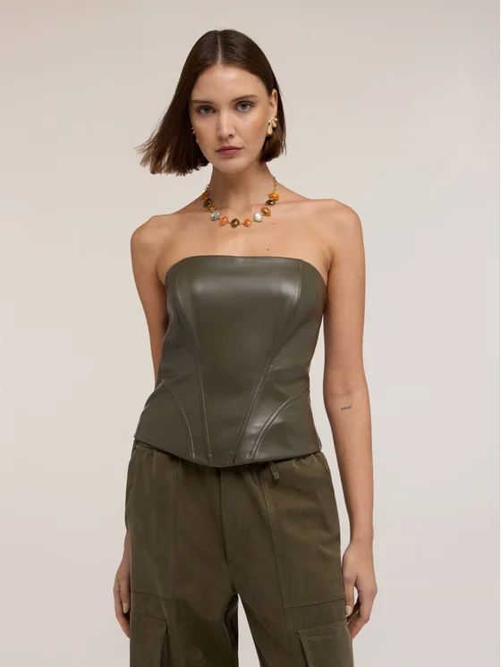 Top bustier in tessuto effetto spalmato; vestibilità fitted con chiusura zip; scollatura a v con cuciture decorative; MADE IN ITALY.