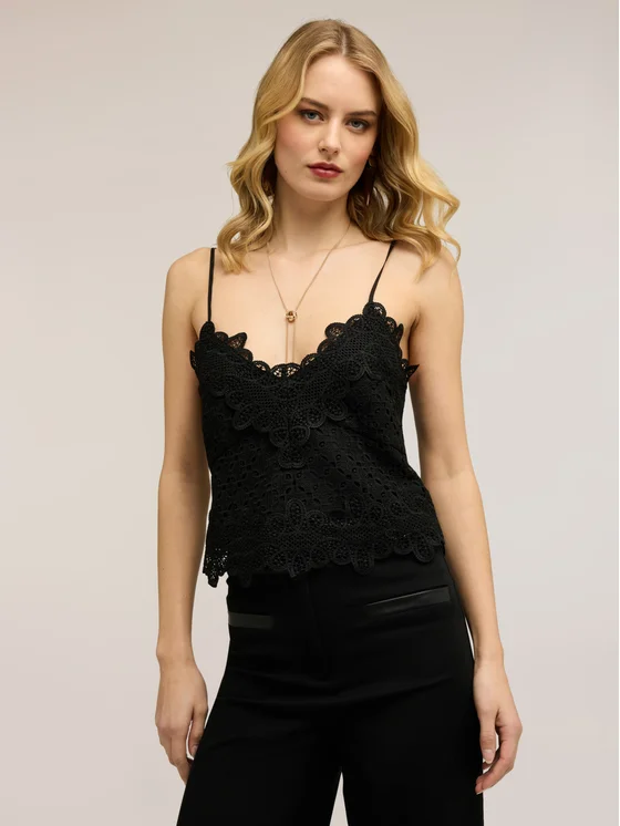 Top in sangallo con lavorazione in pizzo macramé; vestibilità fitted, chiusura con zip posteriore a vista; spalline sottili regolabili, scollatura a cuore con bordatura smerlata.