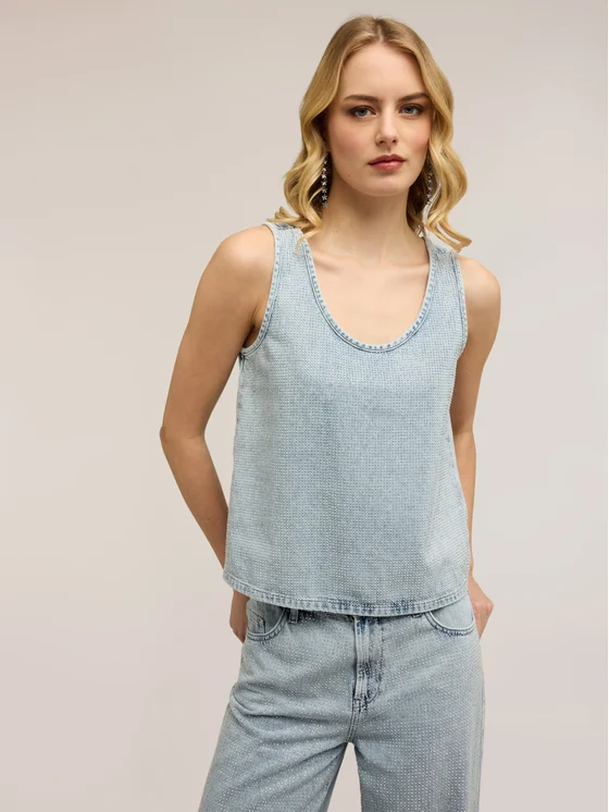 Top in denim con lavorazione stone washed; vestibilità regular con scollatura ampia; spalline larghe, applicazione frontale con cristalli.