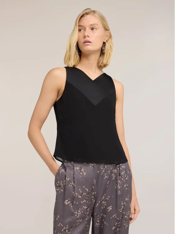 Top in tessuto georgette; chiusura con zip laterale; scollo a V con dettaglio impunture decorative.