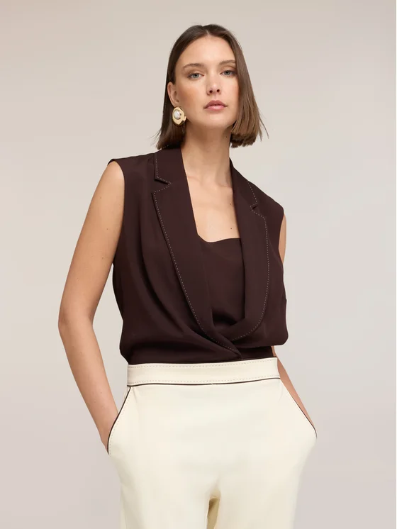 Top a body senza maniche in tessuto crêpe de chine; apertura frontale con colletto a revers e dettaglio di impunture; chiusura su slip con automatici.