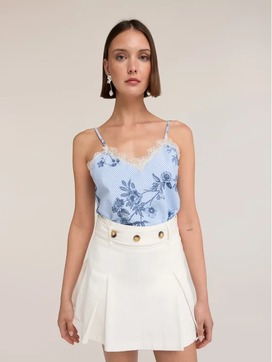 Top in popeline misto cotone a righe con fantasia floreale; scollatura a v con bordatura in pizzo; spalline fini regolabili; MADE IN ITALY.