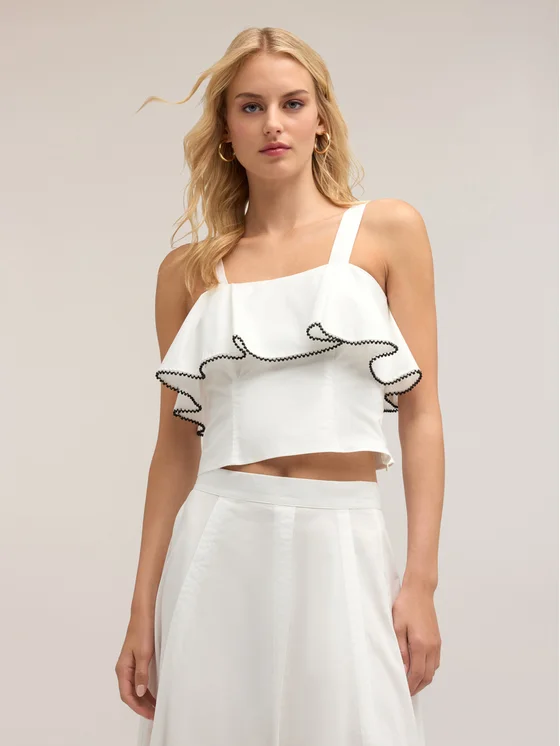 Top in popeline di cotone; scollatura frontale con balza ricamata a perline e spalla larga; chiusura con zip sul fianco