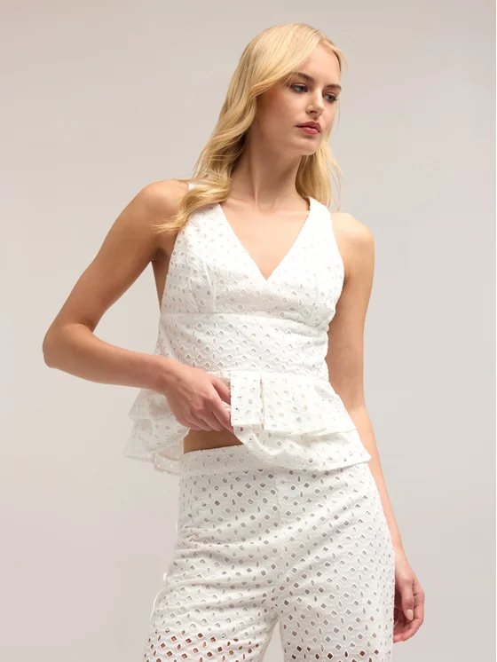 Top in pizzo sangallo tinta unita; profonda scollatura a v frontale, apertura con zip nel centro dietro; motivo di doppia balza sul fondo