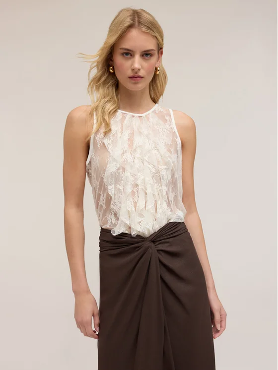 Top in pizzo; scollatura tonda con apertura a goccia posteriore; motivo centrale a rouches