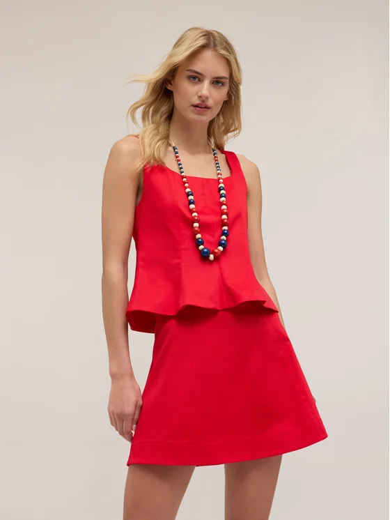 Top peplo in gabardina di cotone elastane; modello senza maniche con scollatura ampia tonda; chiusura laterale con zip
