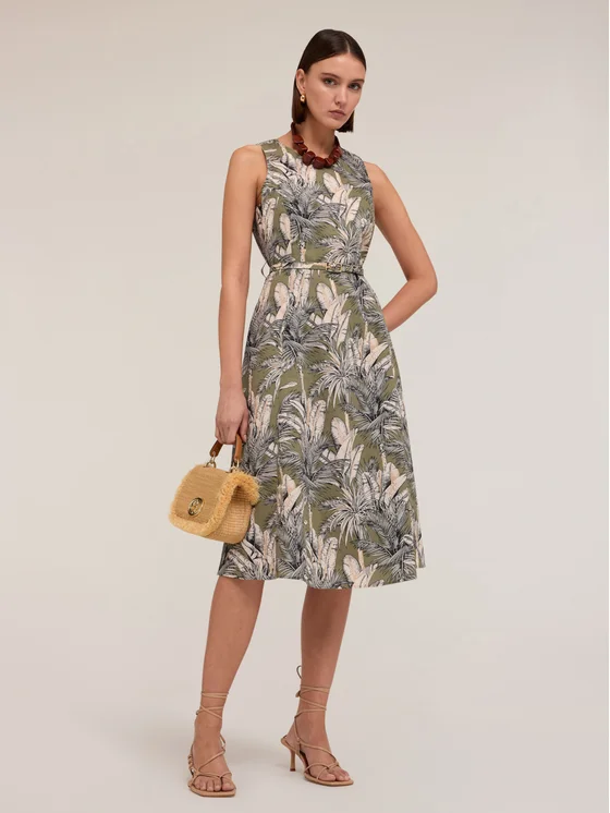Vestito in popeline di cotone fantasia jungle; modello senza maniche con scollatura tonda, chiusura con zip nel centro dietro; piccola cintura in vita tono su tono, gonna flare